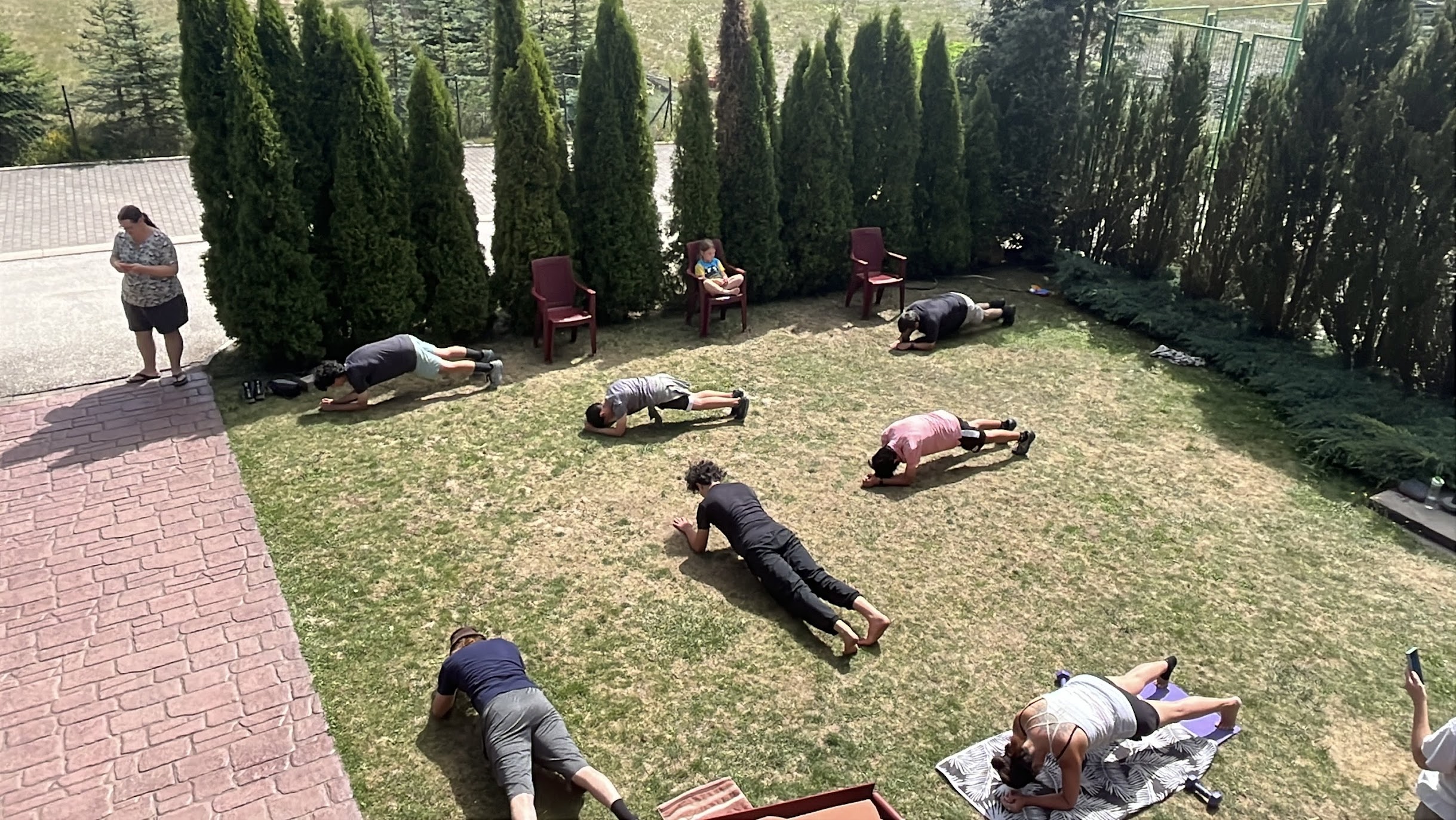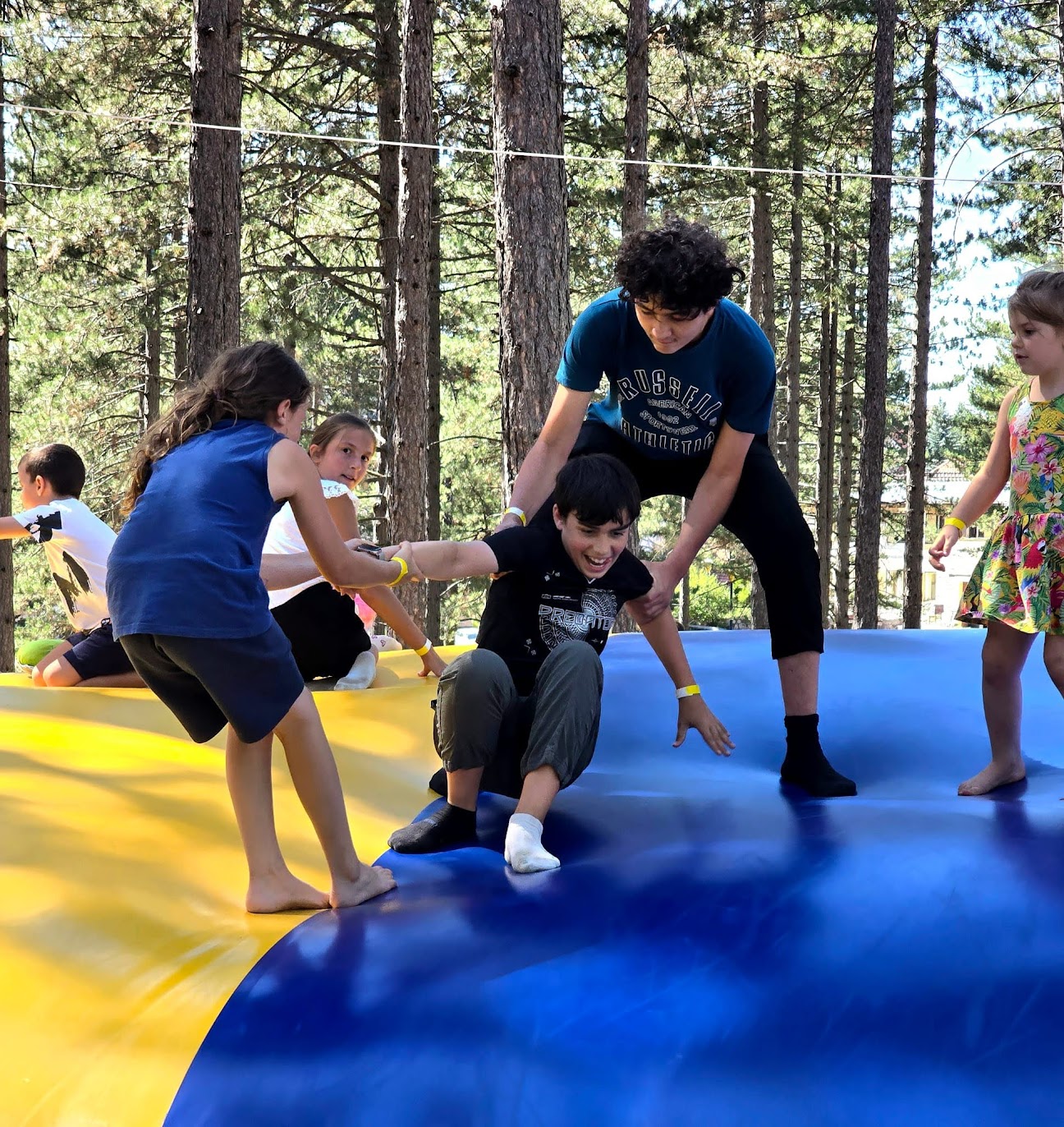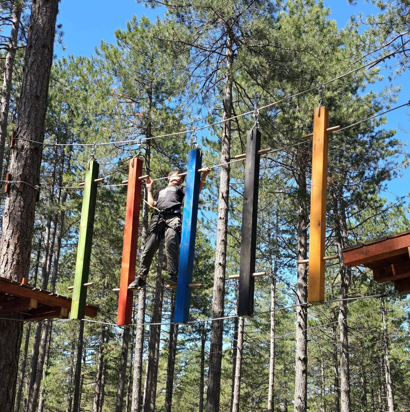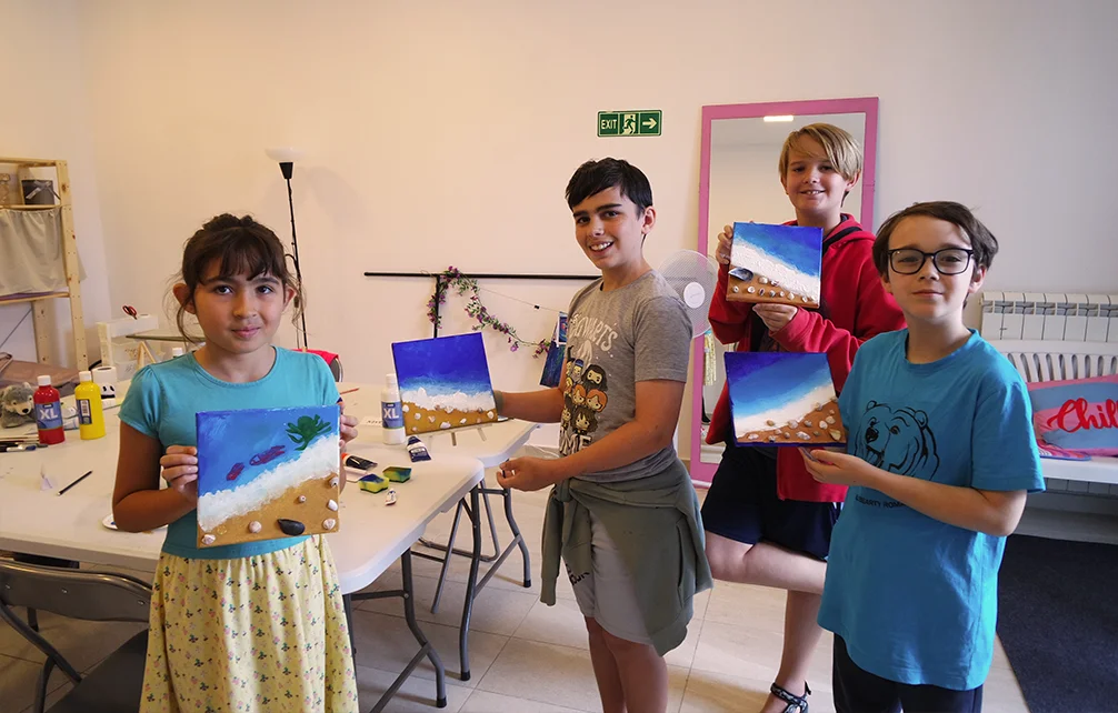 The kids kept up with their art classes, and even the moms did a session where we made self-portraits—a fun (and humbling!) exercise. Outside of the art studio, the kids discovered a jump pillow and adventure park, where Henry worked hard on his flips—nailing both front and back flips by the end of our stay.