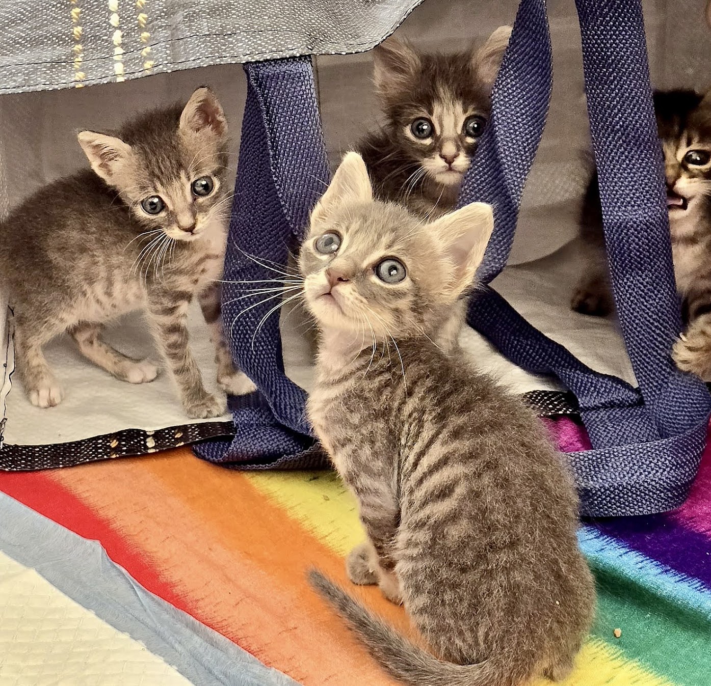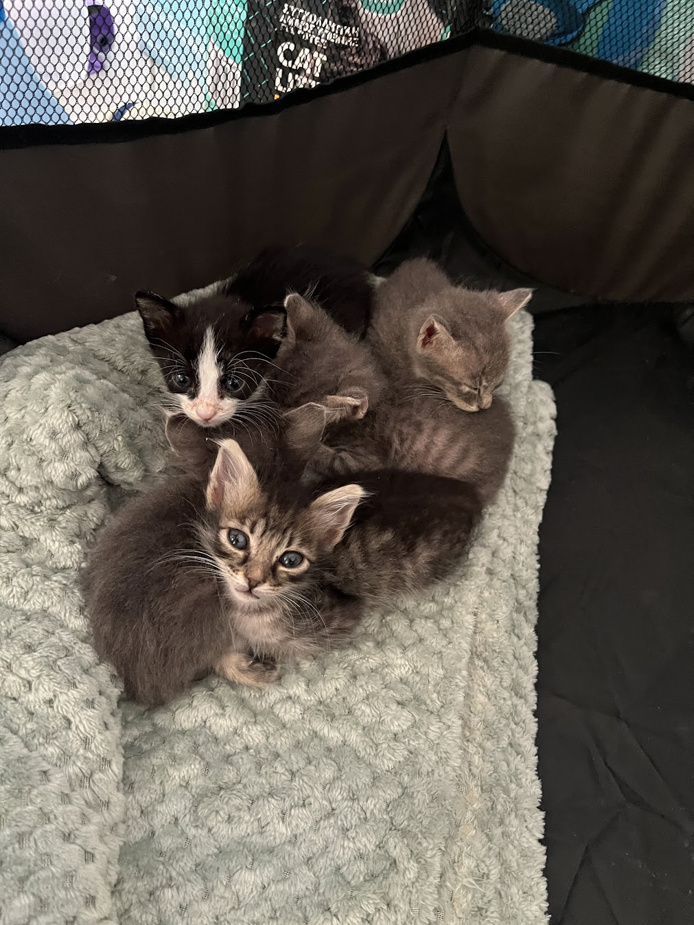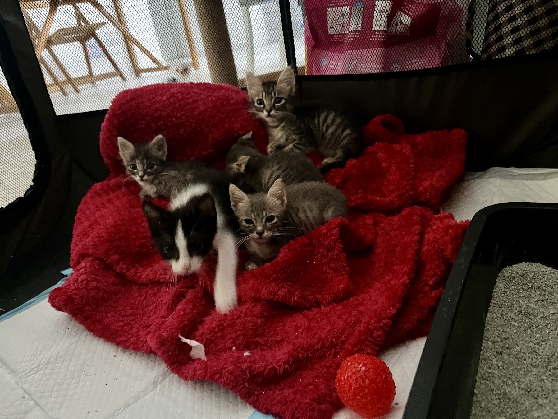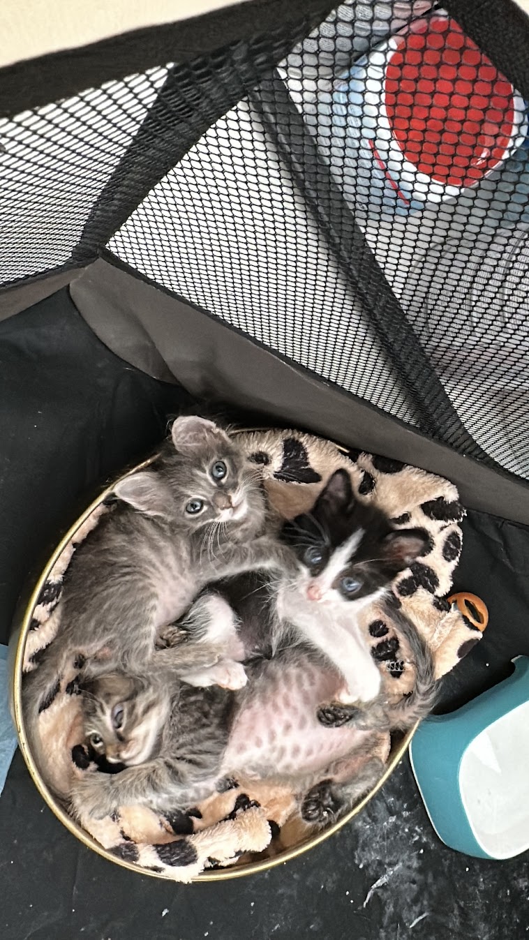Vicki and Renee spearheaded this adventure. They both have a lot of experience fostering and taking care of animals. When they first arrived, these kittens were so small and fragile. Renee and Vicki were the true heroes — taking the night shifts, bottle-feeding every few hours, and making sure each kitten stayed warm and hydrated. Those early weeks were exhausting, but full of sweet, sleepy snuggles. Unfortunately, not long after arriving, all five kittens got sick. It was heartbreaking — so many vet trips, medications, and long nights for Vicki and Renee— but they worked tirelessly to nurse them back to health. Slowly, their eyes brightened, their appetites returned, and those little tails started wagging again.