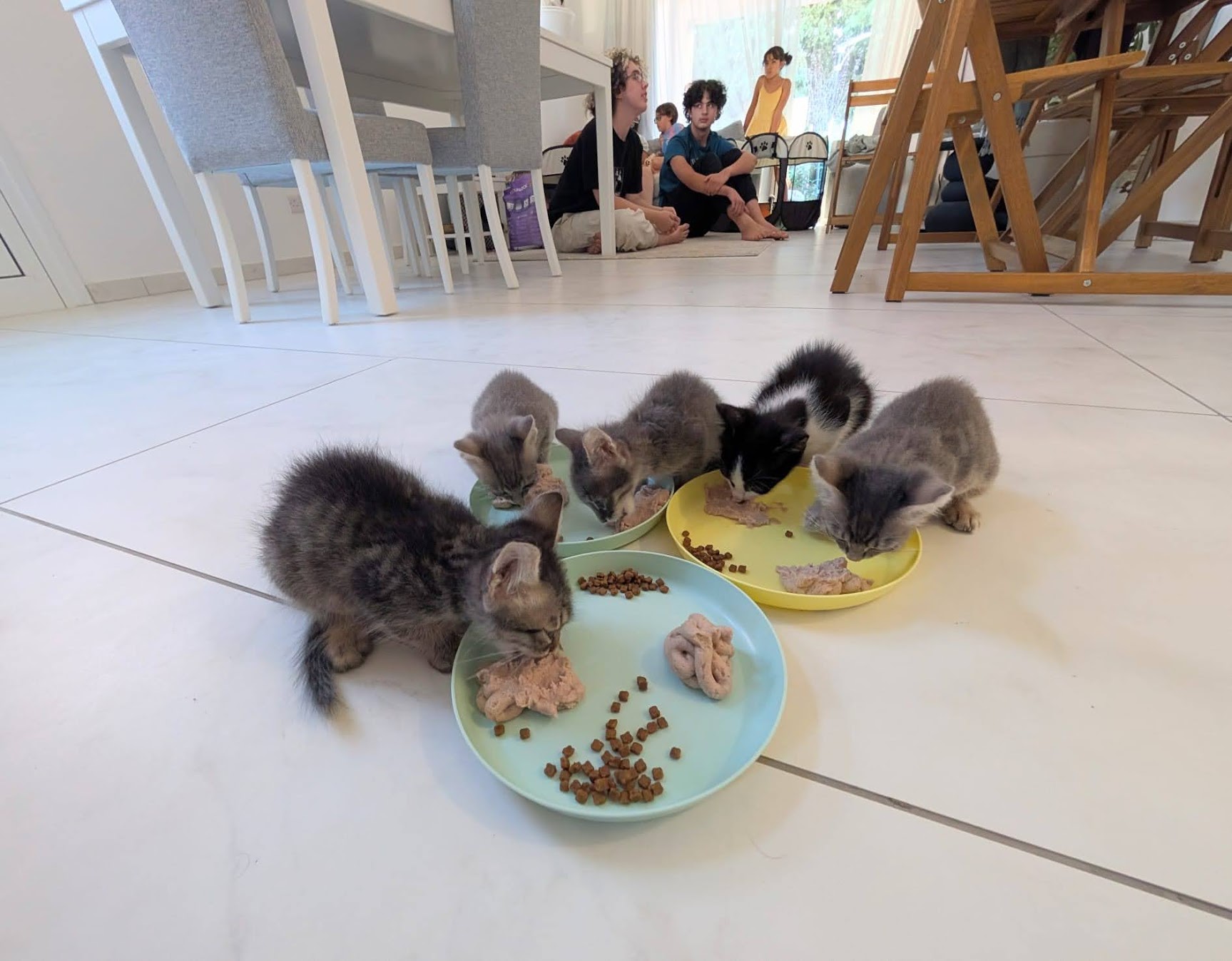 Once they were stable, I took on the early morning shift — feeding time, cleaning their enclosure, and generally trying to keep the chaos under control. There’s something oddly peaceful about being up early with a bunch of tiny kittens, even if it does mean constant kitty litter cleaning. Lucas and Henry loved having the kittens around. There were giggles, cuddles, and countless games of chase-the-string. Fostering is definitely a lot of work — there’s feeding, cleaning, vet visits, and constant supervision — but it’s also rewarding. Watching these tiny, fragile kittens grow into healthy, happy little cats is something we’ll never forget.