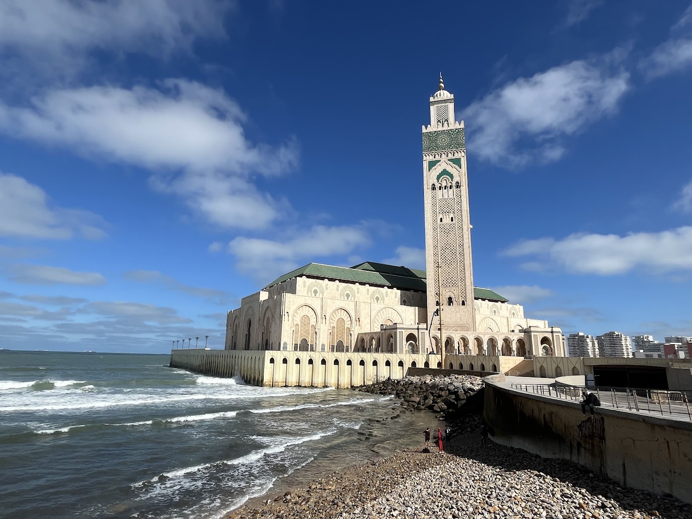 On day three, we took a day trip to Casablanca. Casablanca is an easy one-hour and fifteen-minute train ride from Rabat. It is five times the size of Rabat. Since we only took a day trip, we hit the highlights. We saw the Hassan II mosque, the biggest mosque in Africa and the 7th largest in the world. King Hassan II wanted the mosque to appear as if it were floating on the Atlantic. It has heated floors and a retractable roof, and it cost $800 million to build. A lot of that money came from public donations, which was controversial at the time because many Moroccans donating money to the mosque were poor.
